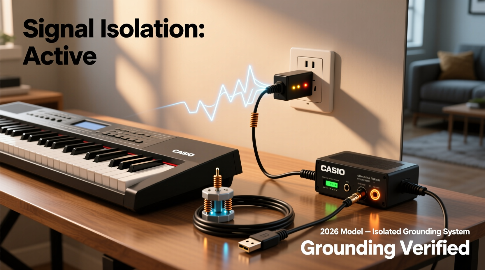 If your Casio keyboard hums or emits audible noise when plugged into apartment wall outlets in 2026, the root cause is almost always inadequate grounding—a widespread issue in older or budget multi-unit buildings where neutral-ground bonding is compromised, shared neutrals exist, or outlets lack true earth ground. Immediate fixes include using a ground-lifting USB isolator, connecting via a balanced audio interface with galvanic isolation, and deploying a UL 1363-listed power conditioner with filtered AC output and ground integrity monitoring (e.g., Furman PL-8C or Panamax MR4100). Never use cheater plugs or ungrounded extension cords—they violate NEC 2023 and increase shock risk.