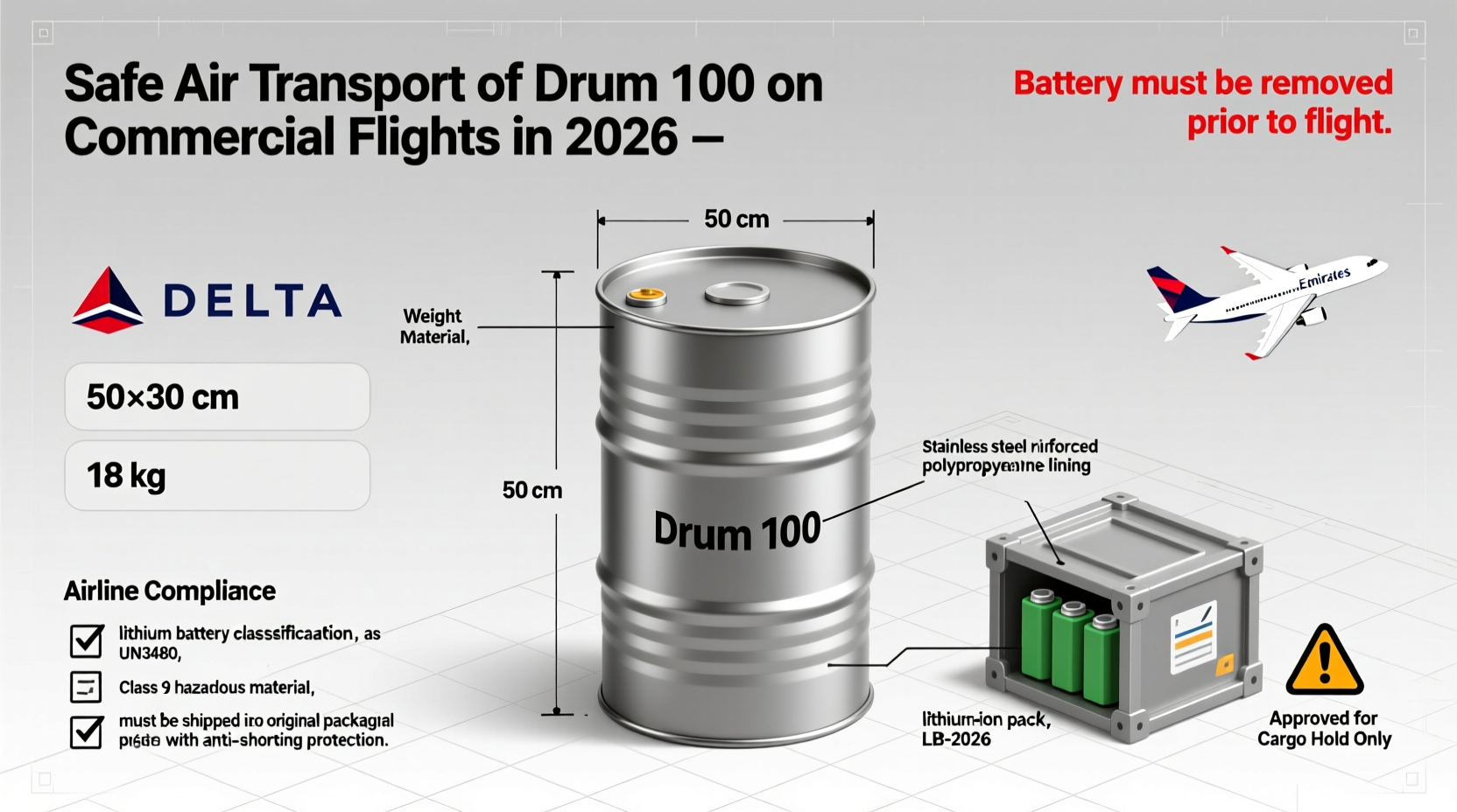 No—air cargo poses higher thermal and pressure risks than passenger cabin or checked baggage. FedEx/UPS classify Drum 100 as “Class 9 Miscellaneous Dangerous Goods” requiring full DG shipping papers, training, and $120+ hazmat fees. For distances <3,000 miles, air travel with compliant case remains statistically safer (per 2025 ICAO DG Incident Database).