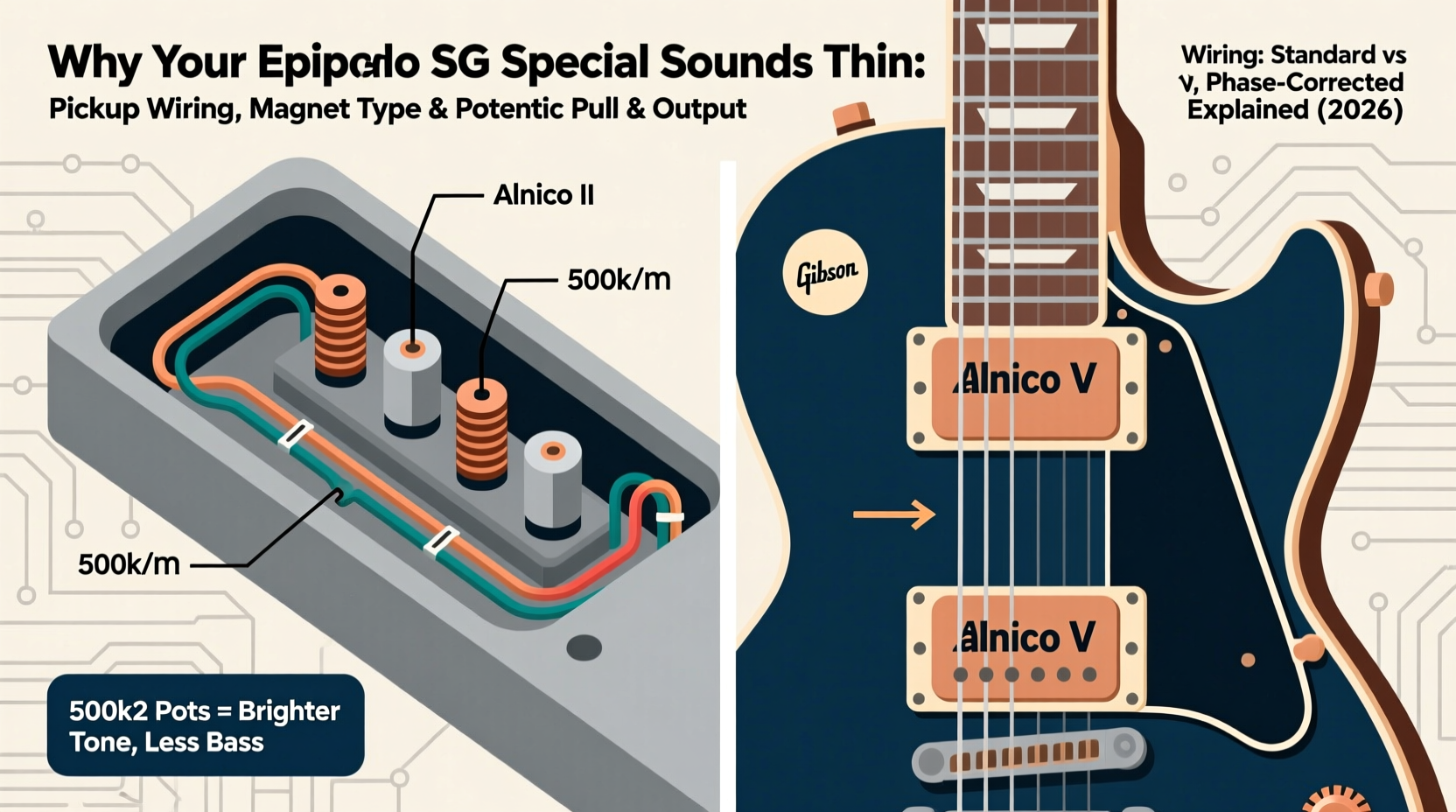 Your Epiphone SG Special sounds thinner than a Gibson SG primarily due to three interrelated hardware differences: (1) lower-output Alnico V pickups with inconsistent winding tolerances, (2) 300kΩ volume/tone potentiometers (vs. Gibson’s standard 500kΩ), and (3) simplified 2-conductor pickup wiring without coil-splitting or phase options—resulting in reduced harmonic richness, weaker midrange presence, and less dynamic headroom.