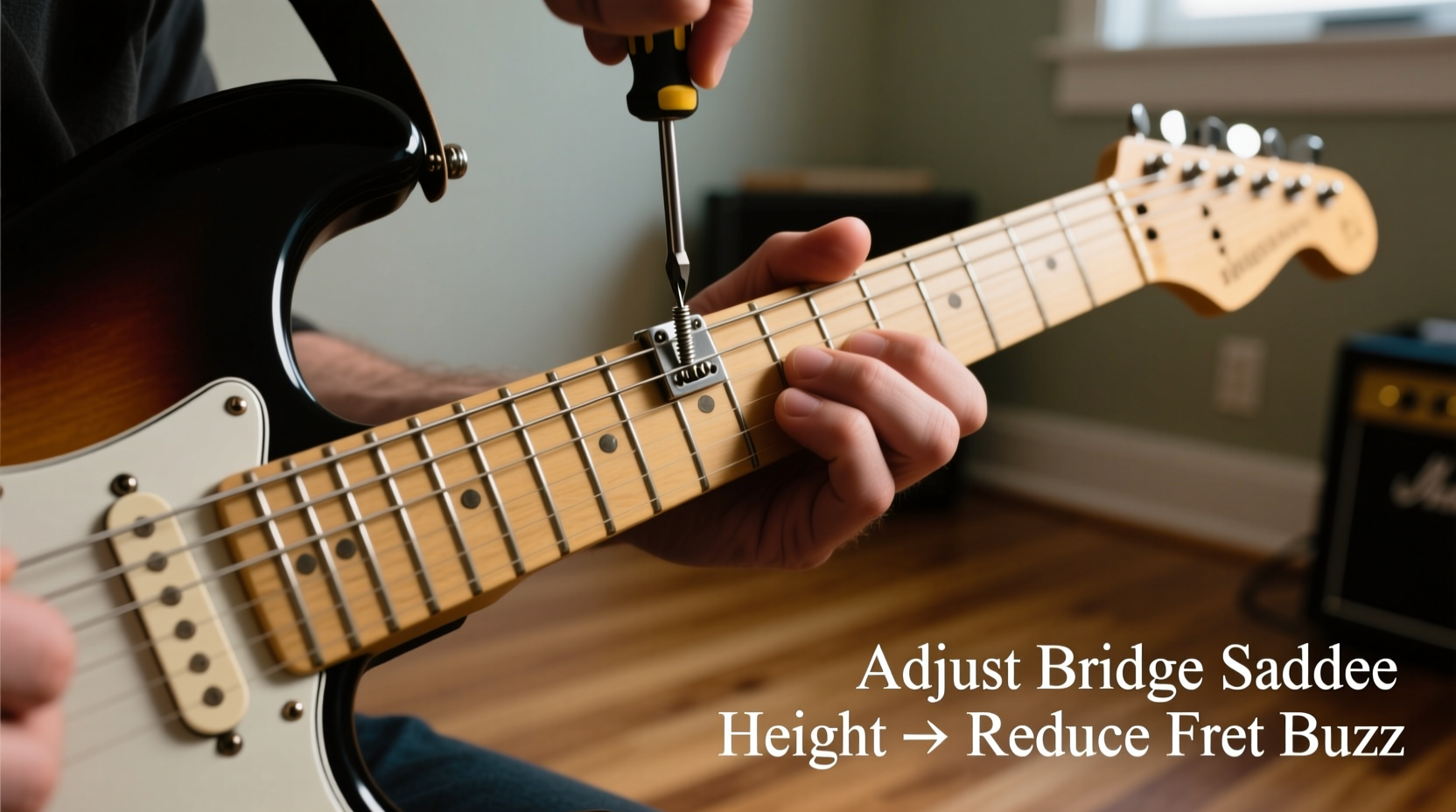 - Recheck intonation after height changes (use harmonic vs. fretted 12th fret test)