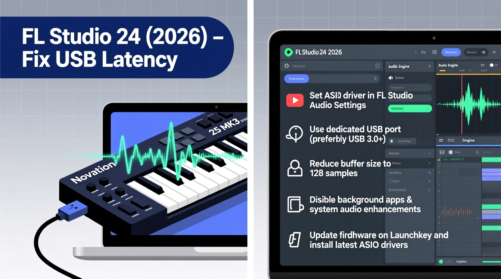 To eliminate persistent USB audio interface latency when using the Novation Launchkey 25 MK3 as a control surface with FL Studio 24 (2026), prioritize ASIO driver configuration, buffer size optimization (≤128 samples), exclusive USB bandwidth allocation, and disable Windows Audio enhancements—not MIDI latency fixes alone, since the Launchkey MK3’s control surface traffic runs over HID, not MIDI, and only affects DAW responsiveness when misconfigured.