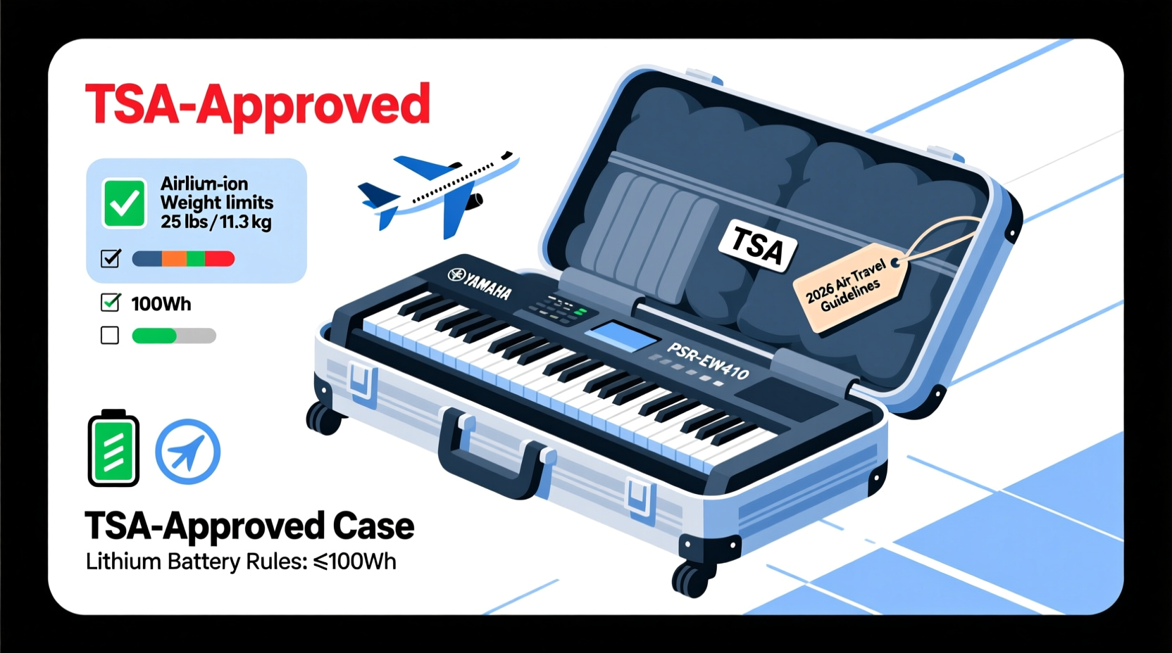Yes — the Yamaha PSR-EW410 is safe and fully compliant to fly with in 2026, provided you follow TSA lithium battery guidelines, use an FAA-compliant hard-shell case, and stay within standard carry-on weight limits (typically 22–26 lbs / 10–12 kg) for touring musicians.