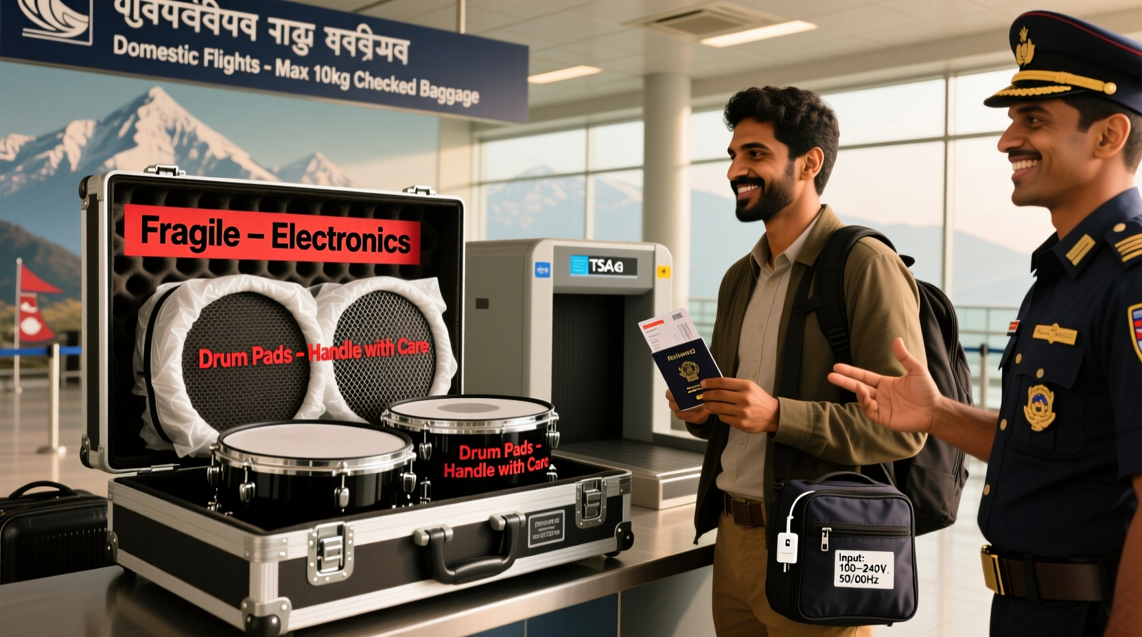 To safely transport a Roland TD-50X drum module and mesh pads on domestic flights in Nepal (2026), pack the module in its original or certified flight case (e.g., SKB iSeries 3i-1712-10), pad all mesh heads with foam inserts, disassemble hardware, label gear as 'Fragile & Musical Instrument', carry power adapters rated for 230V/50Hz (Nepal’s standard), and declare equipment at customs using Form A-2 with manufacturer invoices—ensuring total checked weight stays ≤20 kg (standard limit for most Nepali carriers) to avoid surcharges.