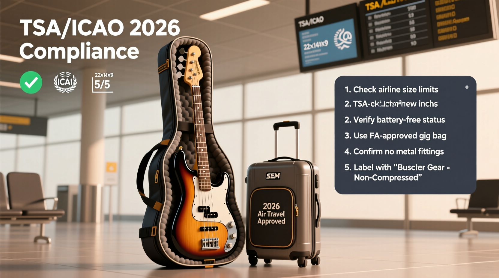 - Airlines may enforce gate-check policies for oversized instruments — but SEM basses fall below the 45" linear dimension threshold (L + W + H ≤ 45") that triggers mandatory gate check on most carriers.