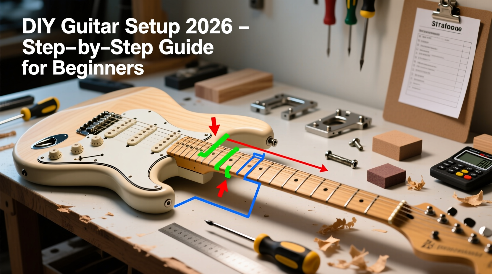 For an unfinished SSS Stratocaster-style guitar body with high string action and fret buzz after DIY neck installation: first verify neck pocket fit and bolt torque (7–9 N·m), then adjust truss rod for 0.008–0.012" relief at 7th fret, level and crown frets if uneven, set nut slot depth (0.018" E6, 0.014" G3), adjust bridge saddle height to 4/64" (E6)–3/64" (G3) at 12th fret, and intonate using a strobe tuner. All steps require calibrated tools and incremental checks.