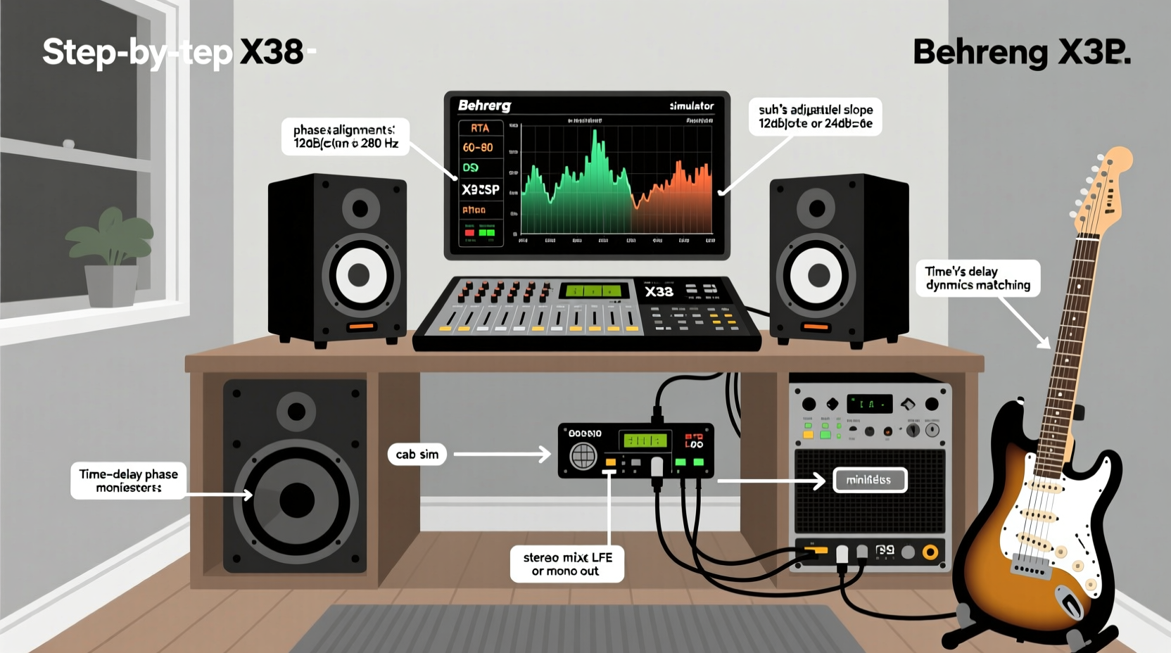To set up an active subwoofer with a Behringer X32 and guitar cab sim in a small home studio for optimal low-end integration in 2026, route your guitar signal through the X32’s internal FX or insert path to a high-quality cab sim (e.g., Neural DSP Quad Cortex IR loader or Two Notes Wall of Sound), send the processed stereo (L/R) main output to your full-range monitors and feed a dedicated mono sub output via X32’s Aux Out (e.g., Aux 1) — configured as a post-fader, low-passed signal — then precisely align phase using the X32’s built-in delay (0–100 ms) and polarity inversion, and apply a 24 dB/oct Linkwitz-Riley crossover slope for seamless power response and time-coherent summation below 80–100 Hz.