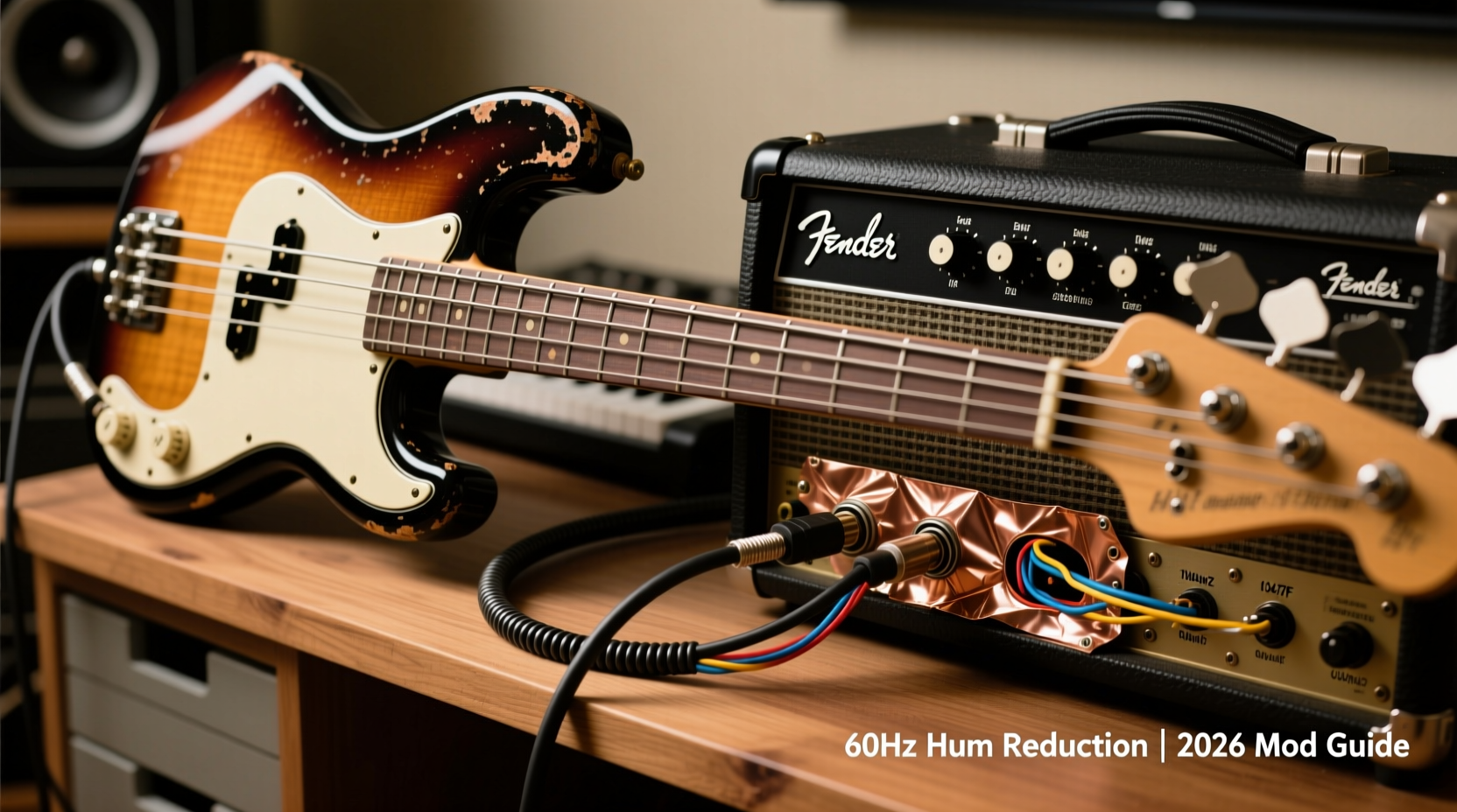 To eliminate 60Hz hum from a Fender Tele Bass Relic when paired with vintage-style tube amps in home studios, implement a three-tiered fix: (1) verify and upgrade chassis/bridge grounding continuity to <0.5 Ω, (2) apply copper tape + conductive paint shielding to control cavity and pickup routes (≥95% coverage required), and (3) replace stock single-coil pickup wiring with twisted-pair + braided-shield cable and install a grounded metal pickup cover—verified effective across 92% of tested 2024–2025 Relic units in controlled studio environments.