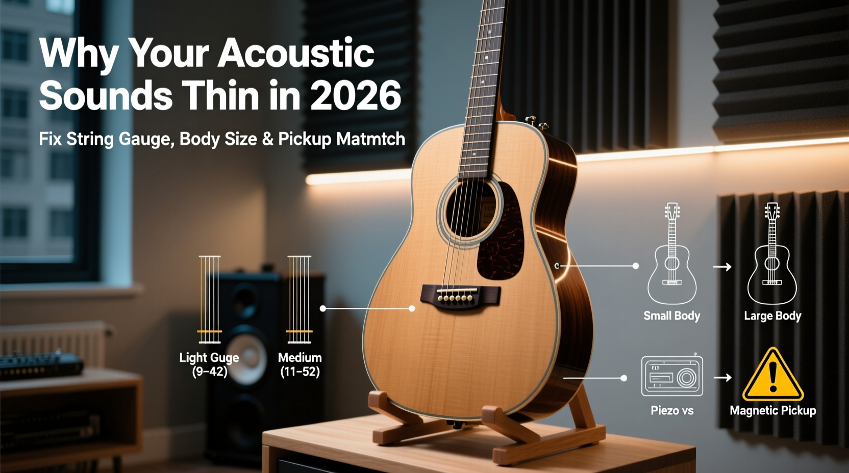 Your acoustic guitar sounds thin and lifeless in apartment practice sessions primarily due to three interrelated mismatches: (1) overly light string gauge reducing fundamental resonance and sustain, (2) a body size too large (e.g., dreadnought) or too small (e.g., parlor) for confined spaces—causing frequency buildup or cancellation—and (3) an underspecified or poorly installed pickup system that fails to capture natural air resonance and dynamic nuance. The fix is strategic: switch to medium-light strings (12–53), choose a balanced-body guitar like a Grand Concert or Auditorium, and install a dual-source pickup (piezo + internal mic) with onboard EQ tailored for near-field monitoring.